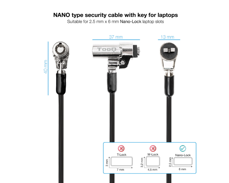 CABLE LOCK DE SEGURIDAD TIPO NANO CON LLAVE PARA PORTATILES 1.5M GRIS TOOQ