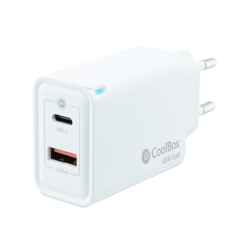 CARGADOR PARED/VIAJE 3.0 GaN USB-C/PD + USB-A 45W BLANCO COOLBOX