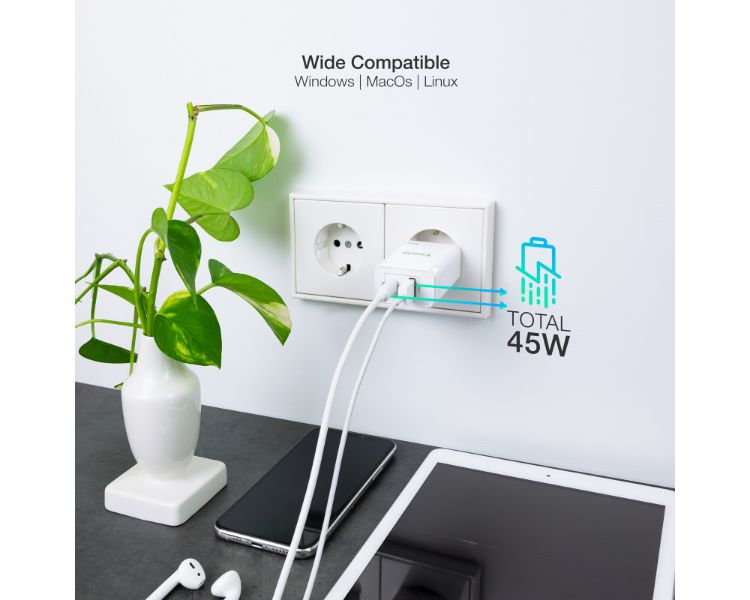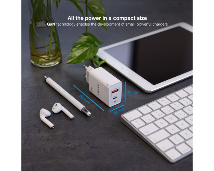 La fabricación con Gan (Nitruro de Galio), permite un suministro de corriente más eficiente disminuyendo las altas temperaturas que soportan los dispositivos. Además, esta tecnología proporciona la ventaja de poder reducir aún más el tamaño de nuestros cargadores.